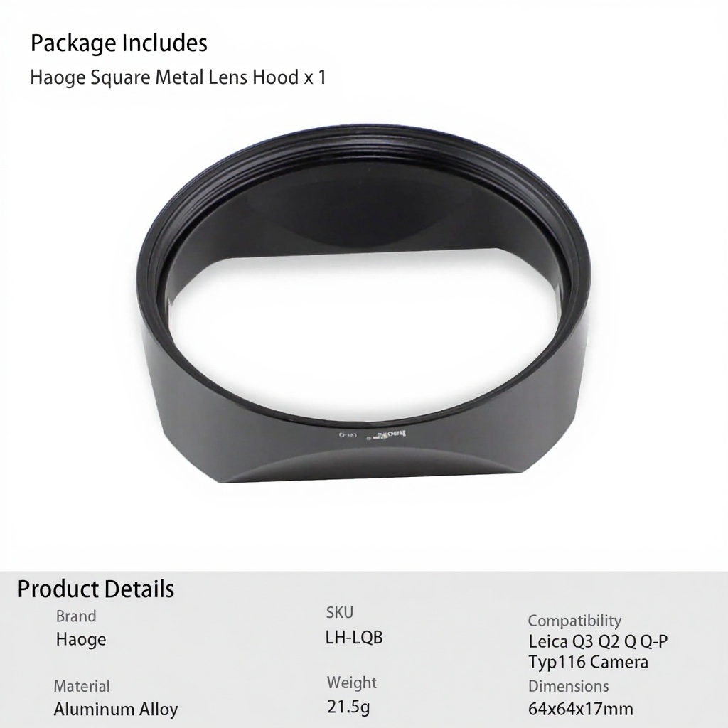 Le pare-soleil carré Haoge LH-LQB est spécialement conçu pour les appareils photo Leica Q3, Q2, Q et Q-P (Typ116). Fabriqué en alliage d’aluminium léger avec un usinage de précision CNC, il assure une finition durable et un ajustement parfait. Son revêtement intérieur mat absorbe la lumière parasite pour optimiser la qualité des images. Les dimensions du produit sont de 9,1 x 8 x 3,7 cm pour un poids de 50 grammes, offrant un encombrement minimal sans compromis sur la protection.